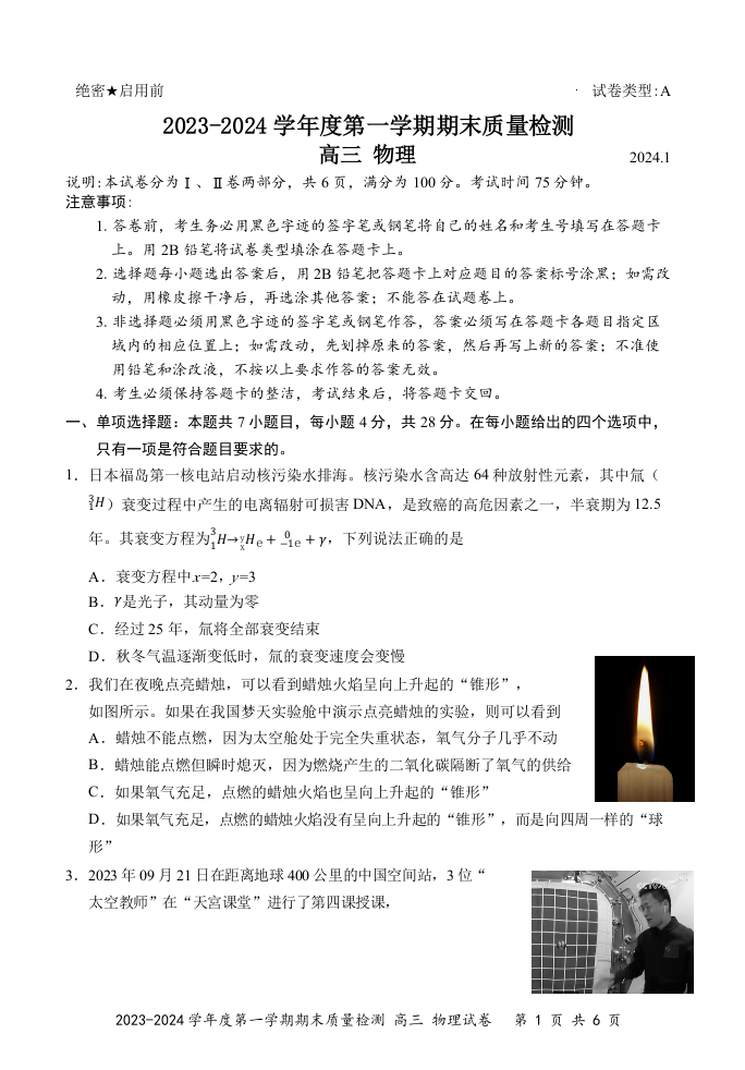 广东省深圳市罗湖区2024届高三上学期期末质量监测物理