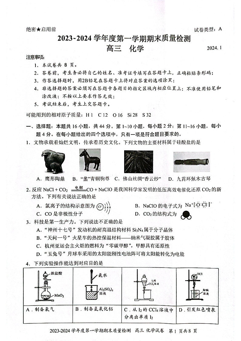 广东省深圳市罗湖区2024届高三上学期期末质量监测化学