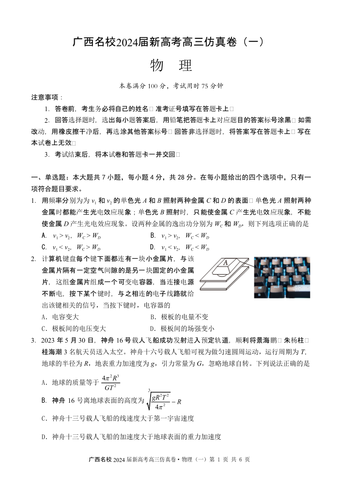 广西名校2024届高三上学期新高考仿真卷(一)物理+答案