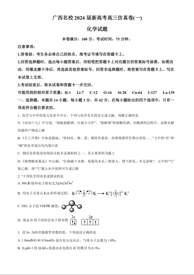 广西名校2024届高三上学期新高考仿真卷(一)化学+答案