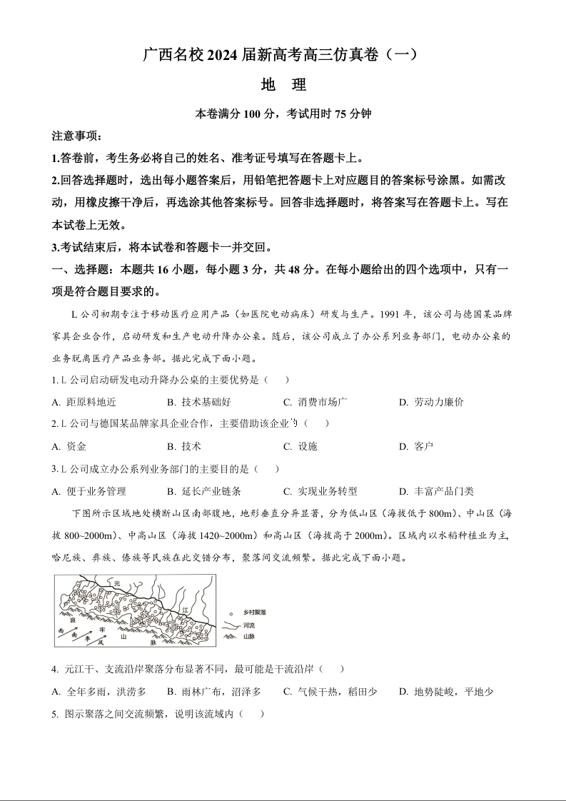 广西名校2024届高三上学期新高考仿真卷(一)地理+答案