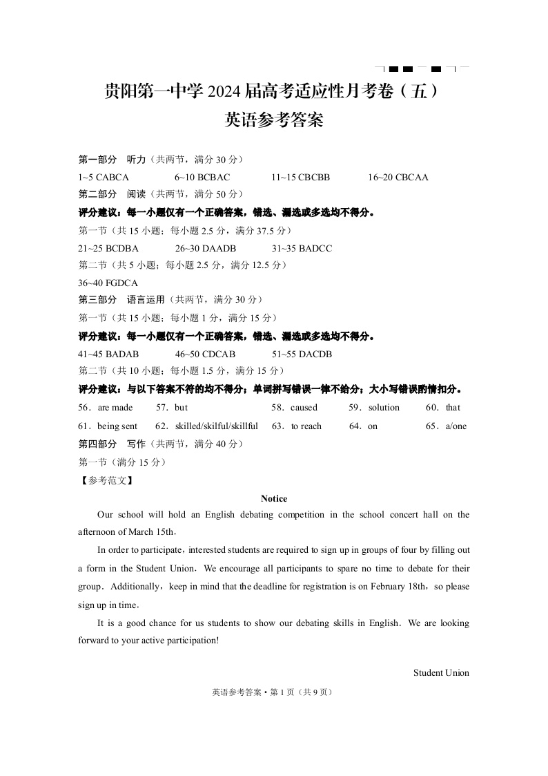 贵州省贵阳市第一中学2024届高三上学期适应性月考(五)英语答案