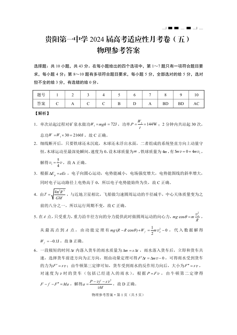 贵州省贵阳市第一中学2024届高三上学期适应性月考(五)物理答案