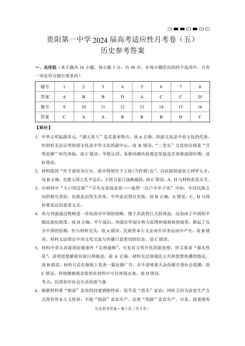 贵州省贵阳市第一中学2024届高三上学期适应性月考(五)历史答案