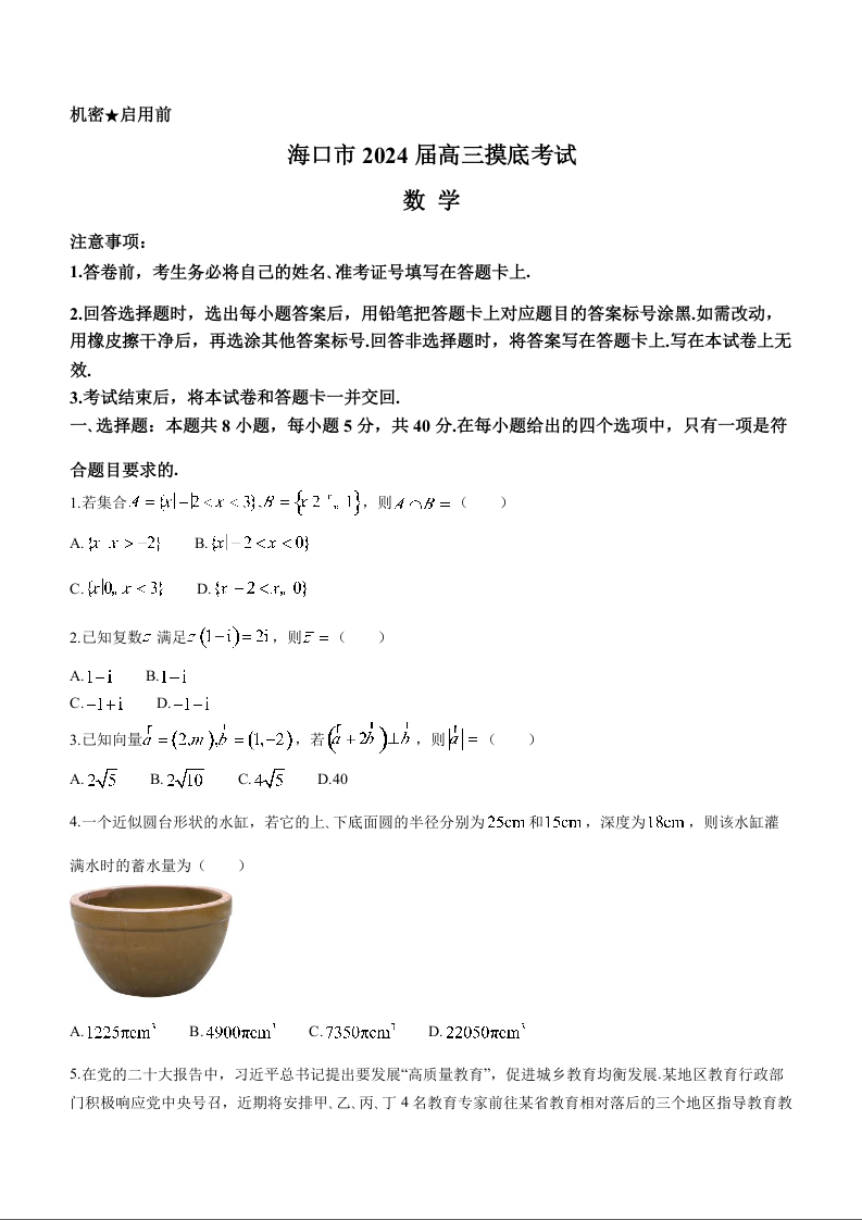 海南省海口市2024届高三上学期1月摸底考试(海口一模)数学+答案