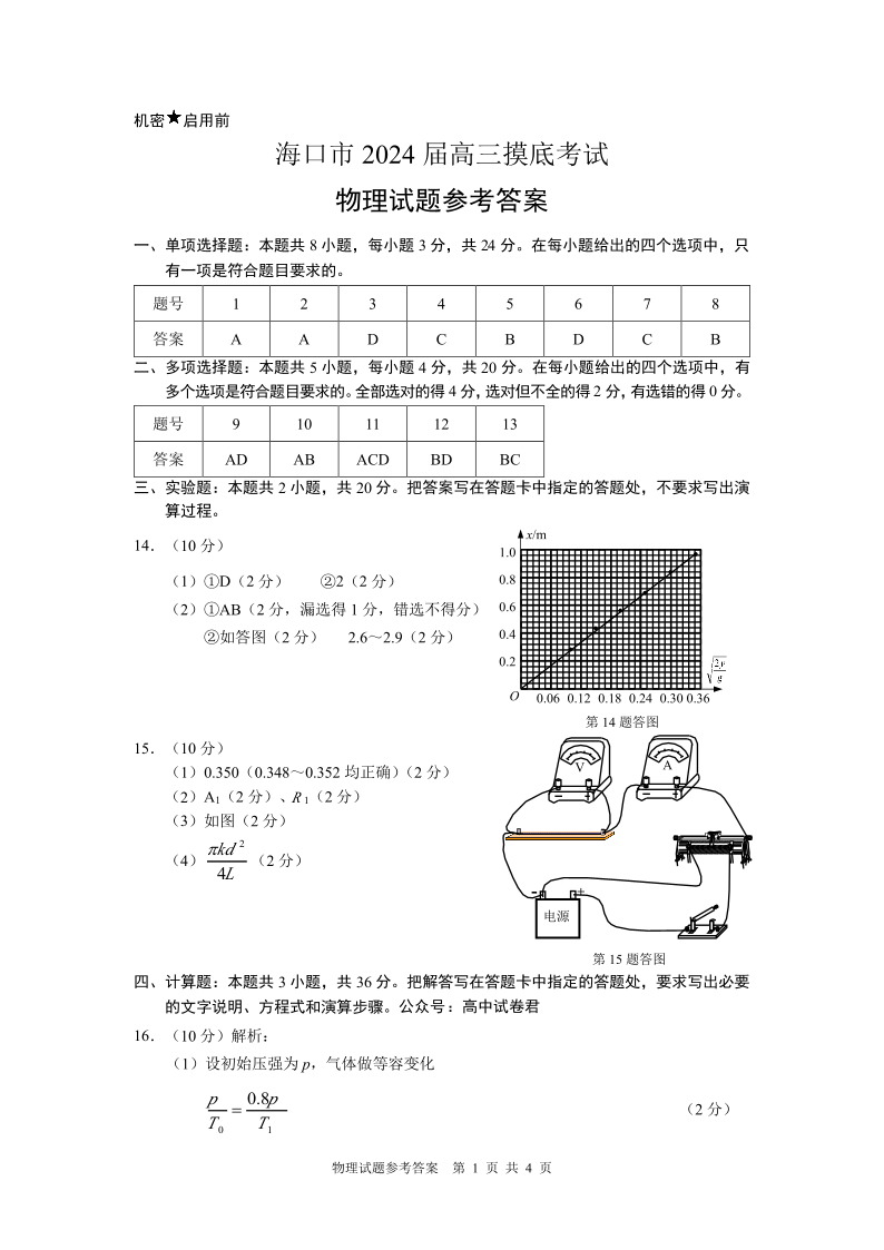 海南省海口市2024届高三上学期1月摸底考试(海口一模)物理答案