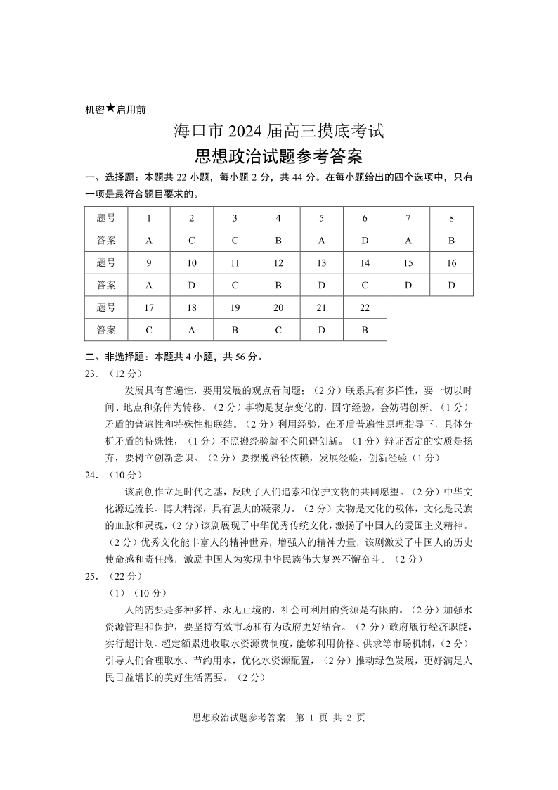 海南省海口市2024届高三上学期1月摸底考试(海口一模)政治答案