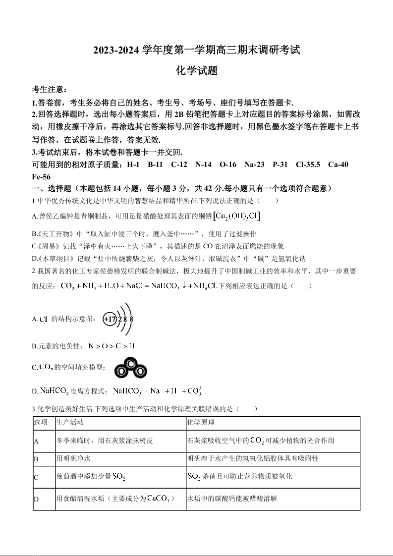 河北省保定市2024届高三上学期期末调研考试化学+答案