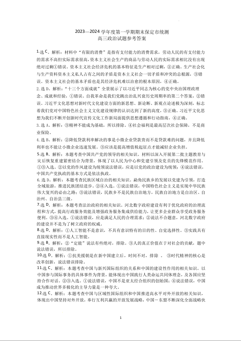 河北省保定市2024届高三上学期期末调研考试政治答案
