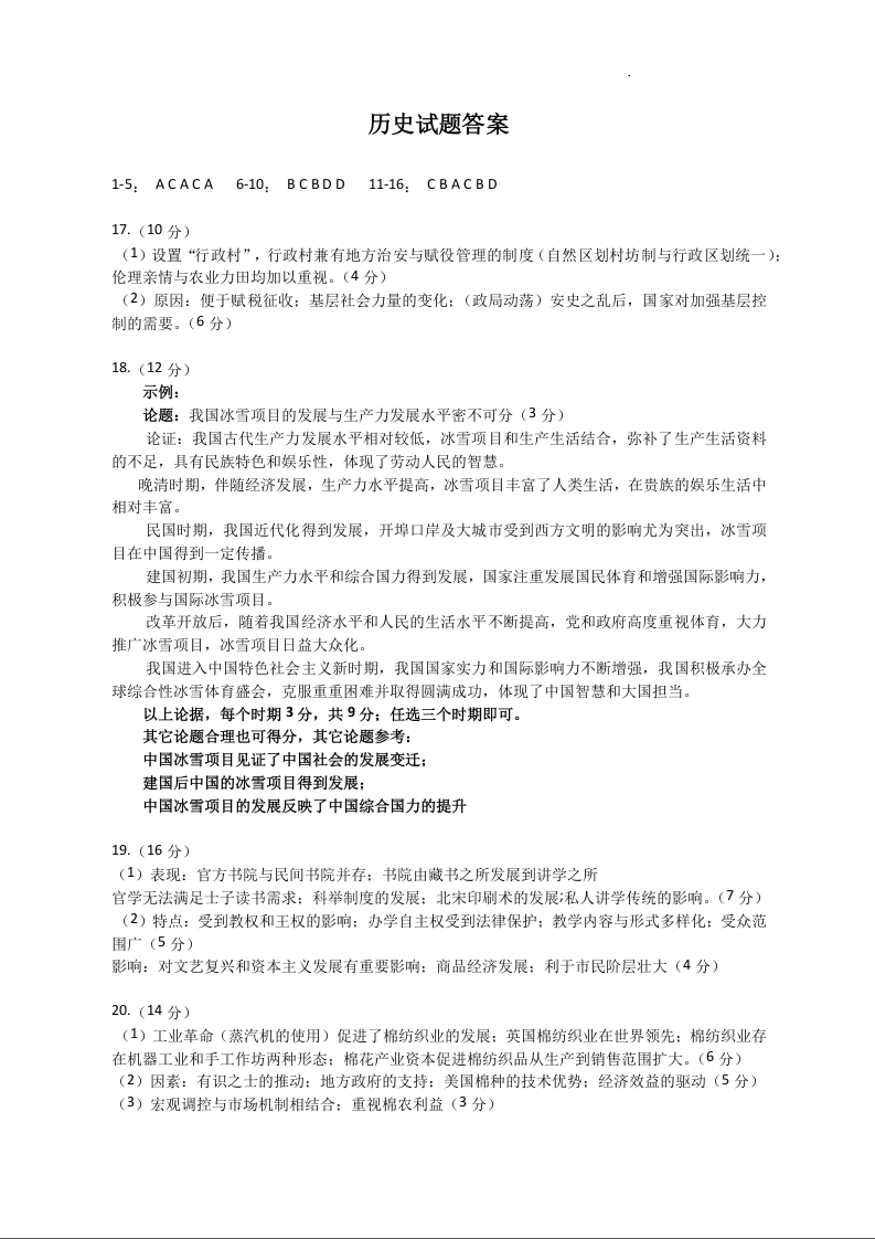 河北省保定市2024届高三上学期期末调研考试历史答案