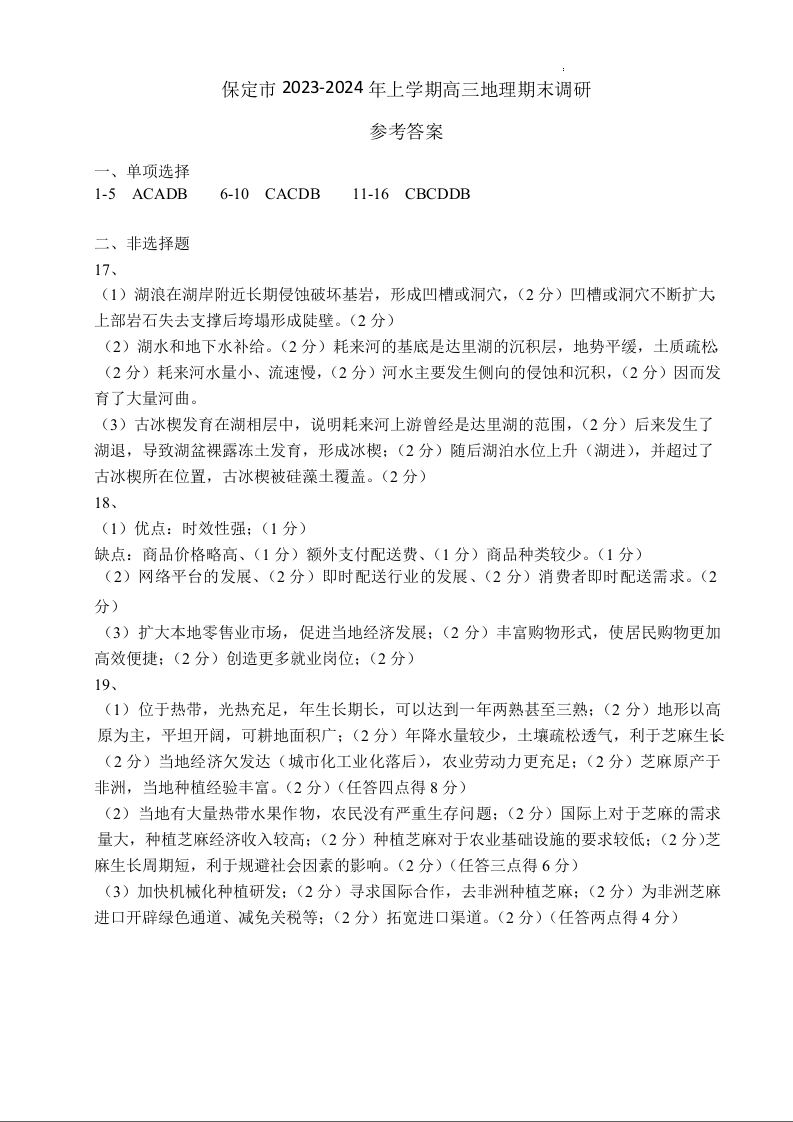 河北省保定市2024届高三上学期期末调研考试地理答案