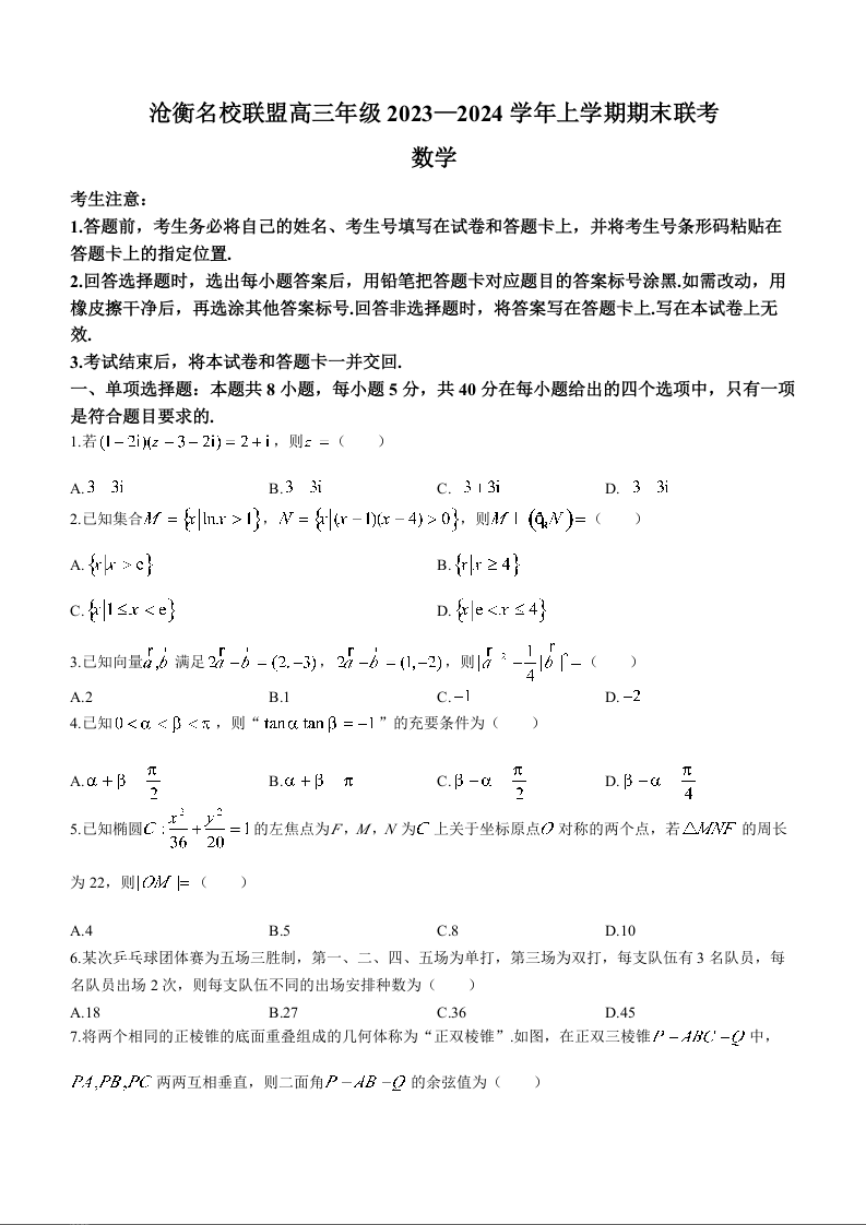 河北省沧州市联考2024届高三上学期1月期末考试数学+答案