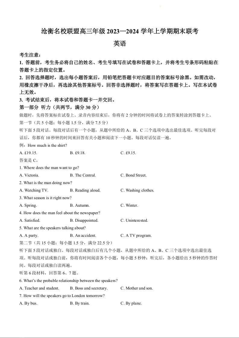 河北省沧州市联考2024届高三上学期1月期末考试英语+答案