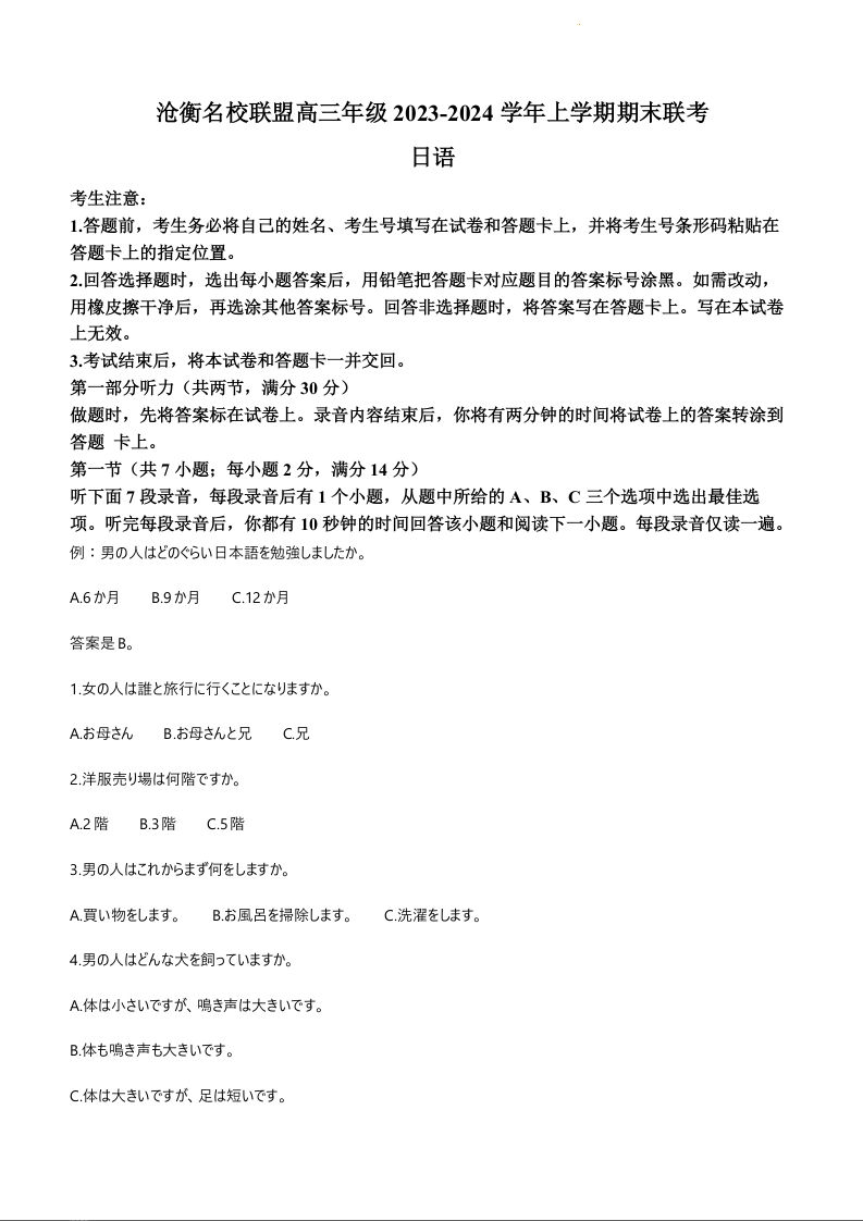 河北省沧州市联考2024届高三上学期1月期末考试日语+答案