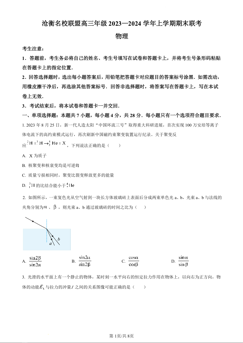 河北省沧州市联考2024届高三上学期1月期末考试物理(原卷版)