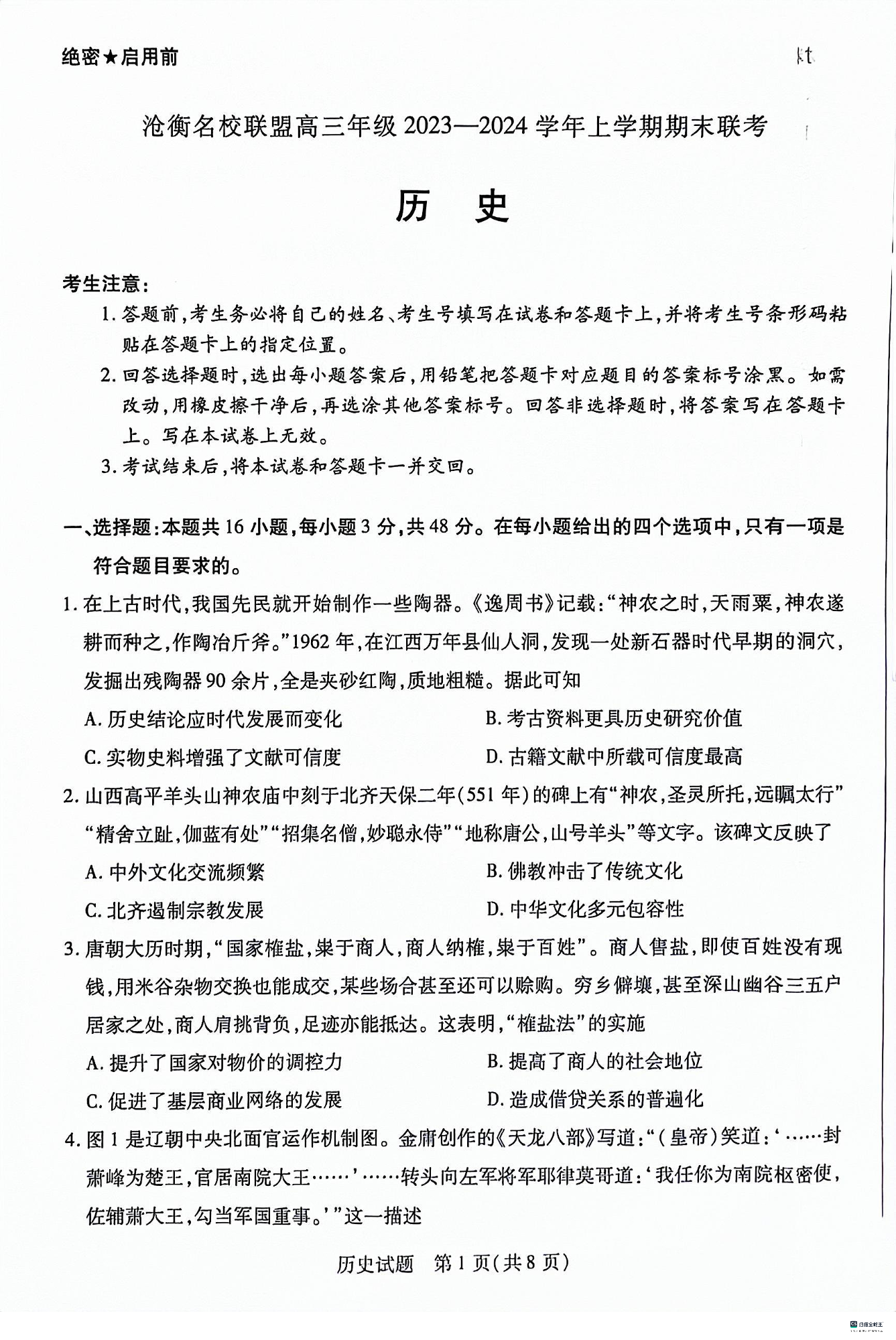 河北省沧州市联考2024届高三上学期1月期末考试历史+答案