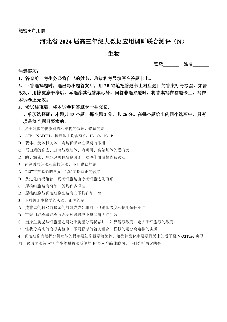 河北省2024届高三大数据应用调研联合测评(Ⅳ)生物+答案