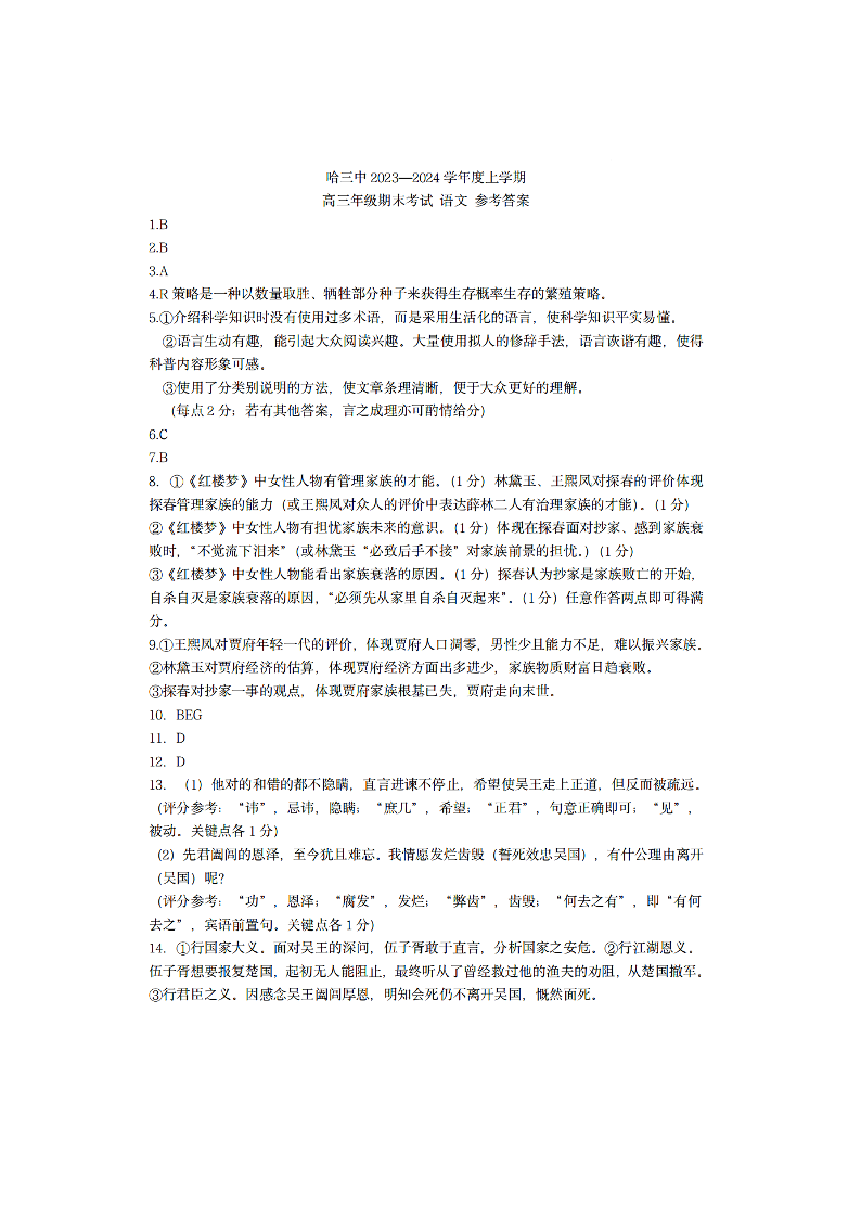 黑龙江省哈尔滨市第三中学校2024届高三上学期1月期末语文答案