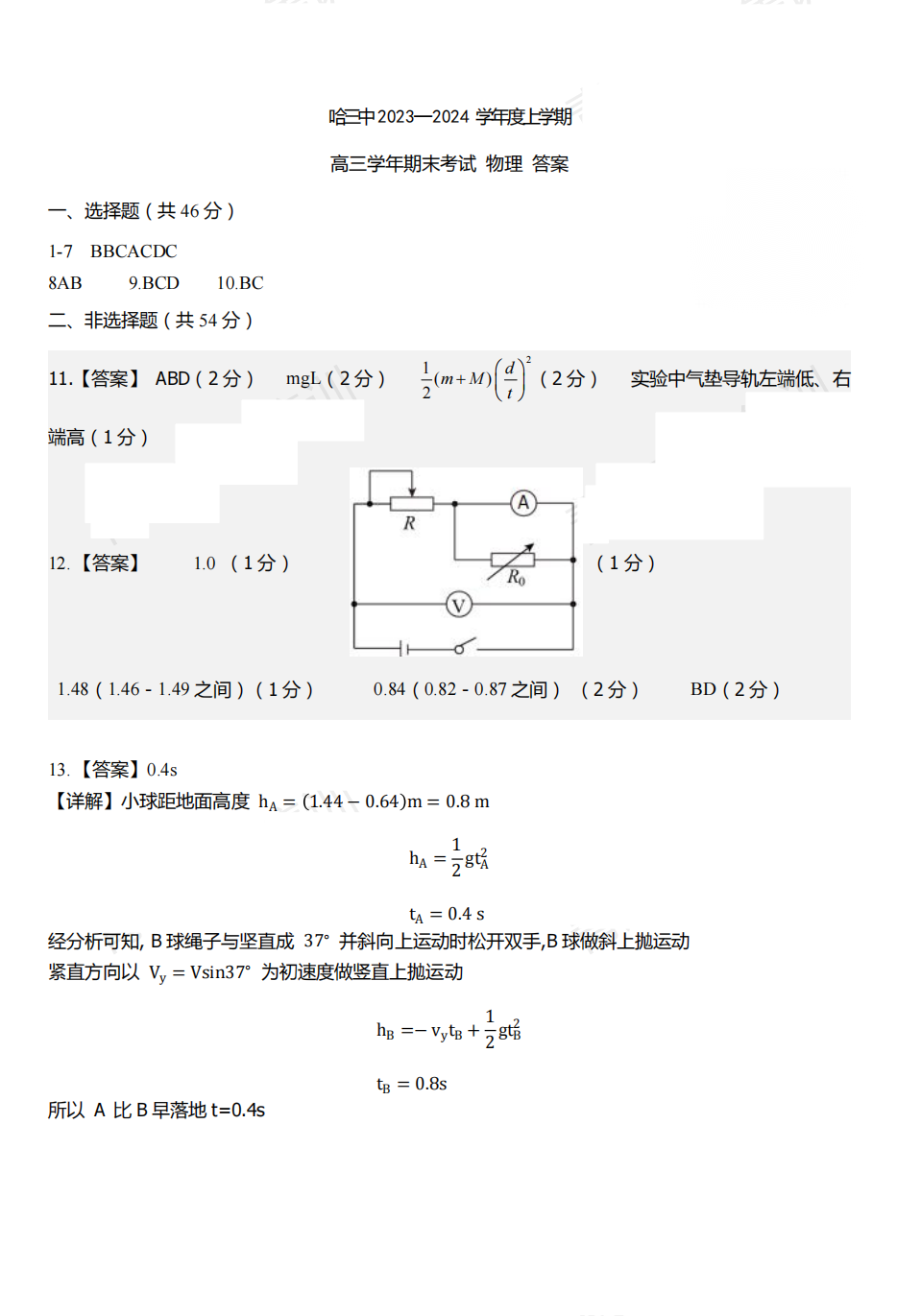 黑龙江省哈尔滨市第三中学校2024届高三上学期1月期末物理答案