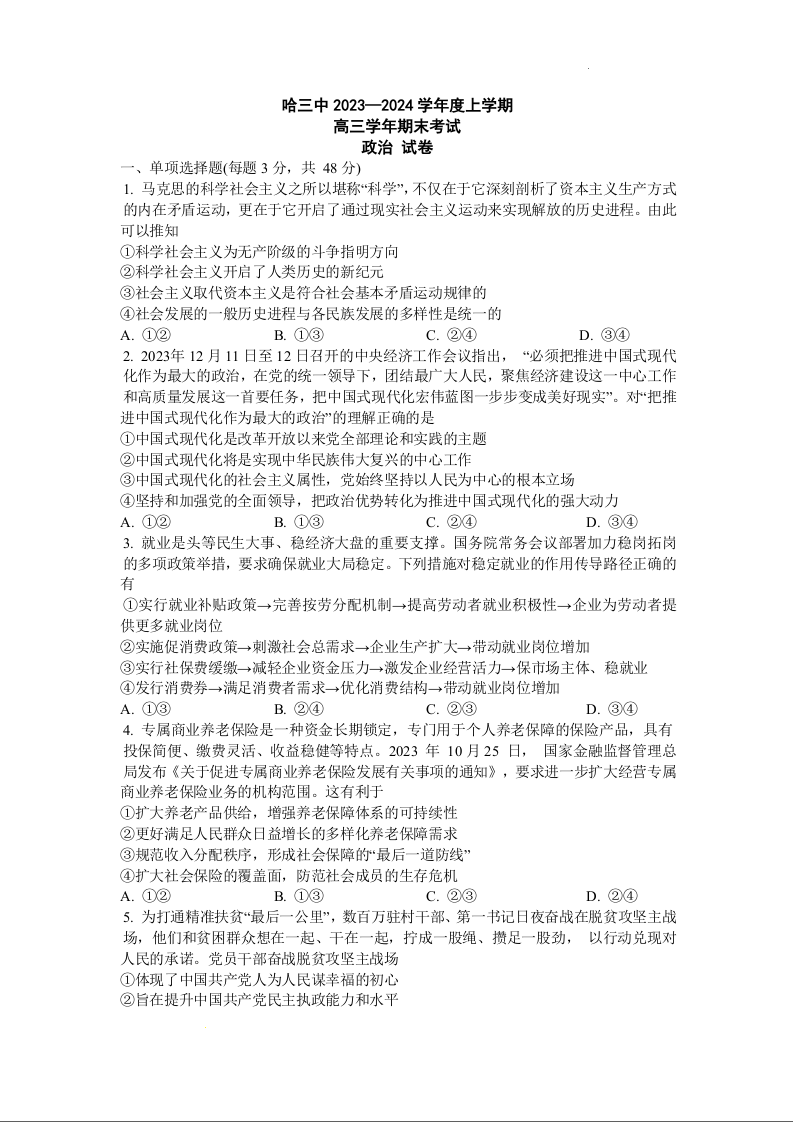黑龙江省哈尔滨市第三中学校2024届高三上学期1月期末政治+答案