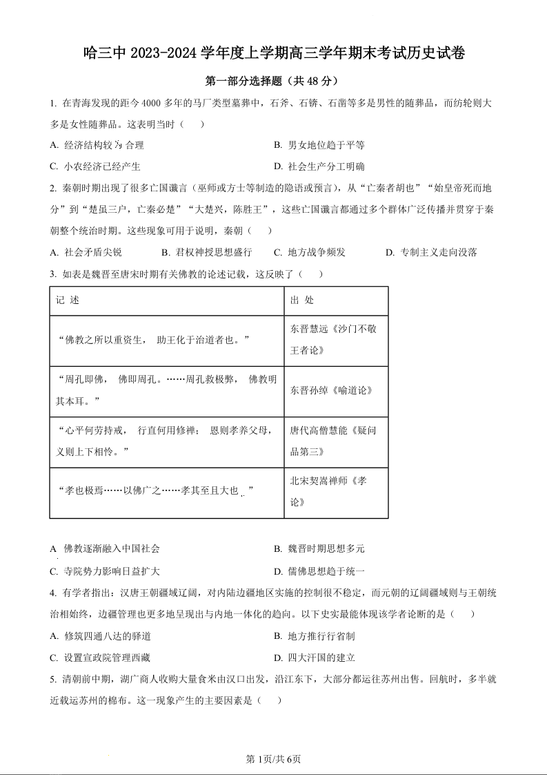 黑龙江省哈尔滨市第三中学校2024届高三上学期1月期末历史(原卷版)
