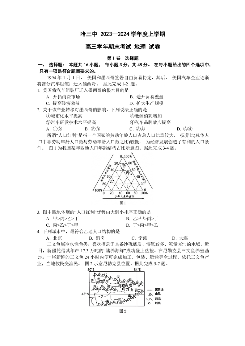 黑龙江省哈尔滨市第三中学校2024届高三上学期1月期末地理+答案