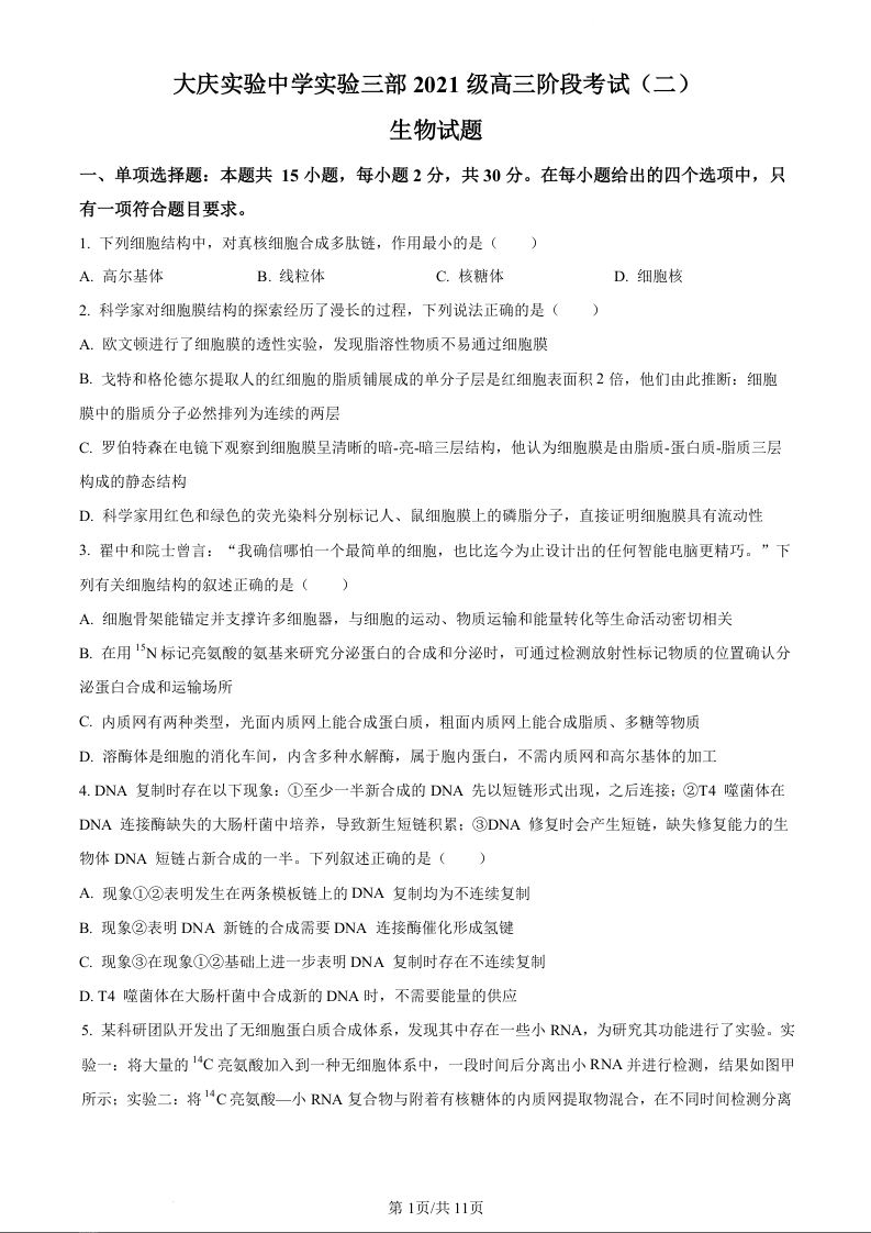 黑龙江省大庆市实验中学实验三部2024届高三上学期阶段考试(二)生物(原卷版)