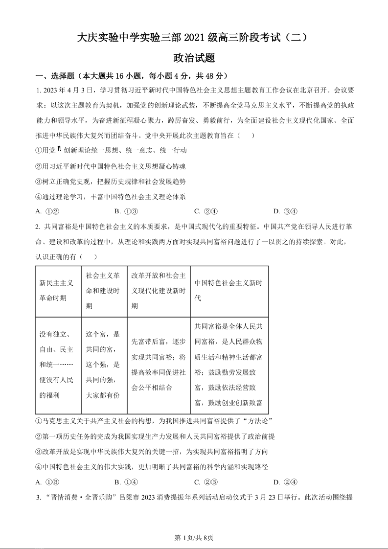黑龙江省大庆市实验中学实验三部2024届高三上学期阶段考试(二)政治(原卷版)