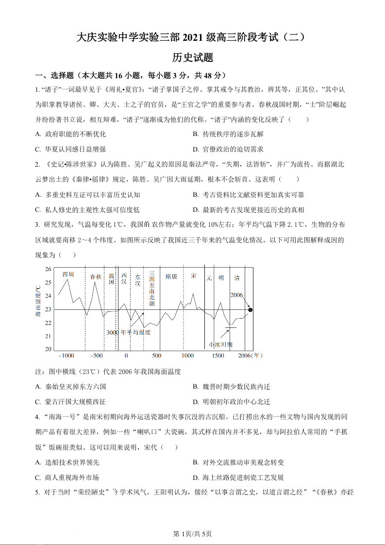 黑龙江省大庆市实验中学实验三部2024届高三上学期阶段考试(二)历史(原卷版)