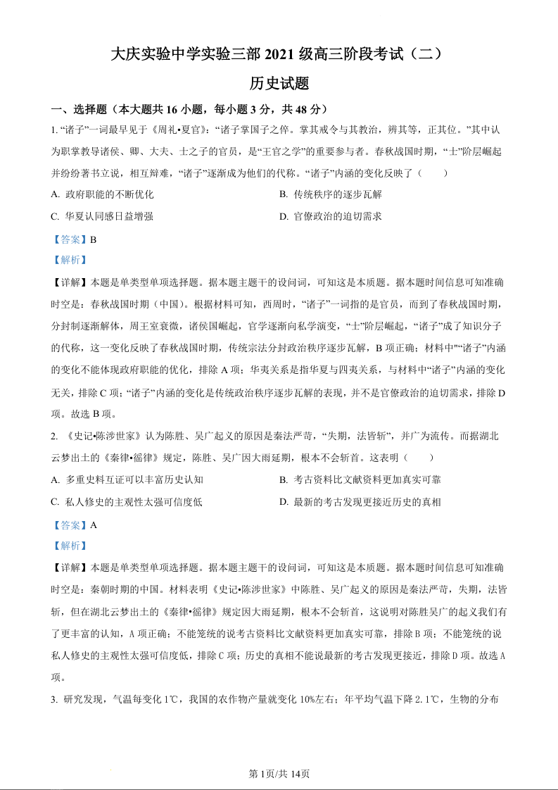 黑龙江省大庆市实验中学实验三部2024届高三上学期阶段考试(二)历史(精品解析版)