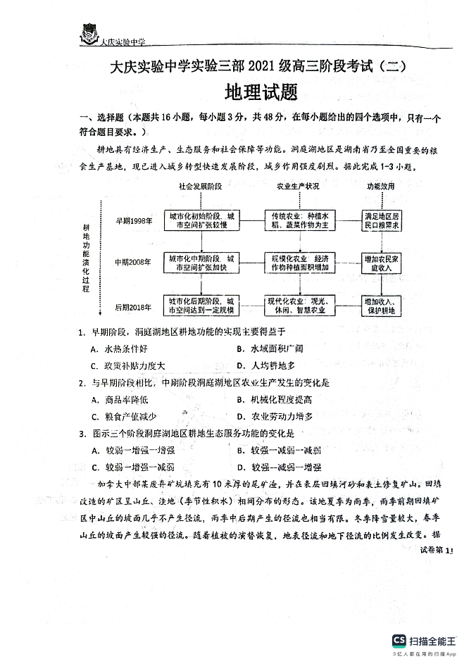 黑龙江省大庆市实验中学实验三部2024届高三上学期阶段考试(二)地理