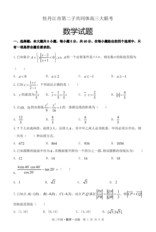 黑龙江省牡丹江市普通高中第二共同体2024届高三上学期期末联考数学+答案