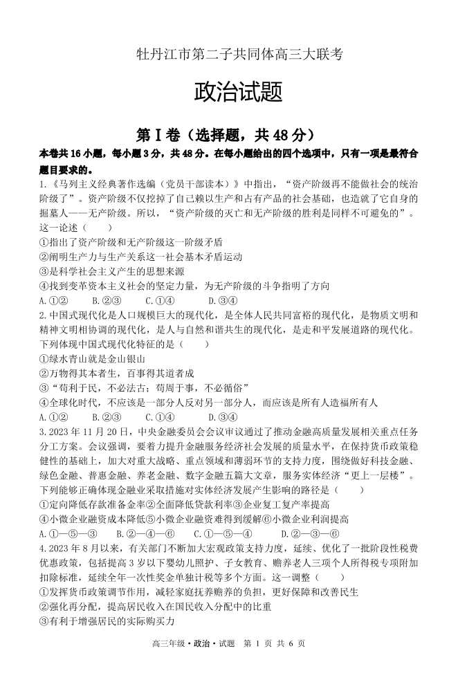 黑龙江省牡丹江市普通高中第二共同体2024届高三上学期期末联考政治+答案