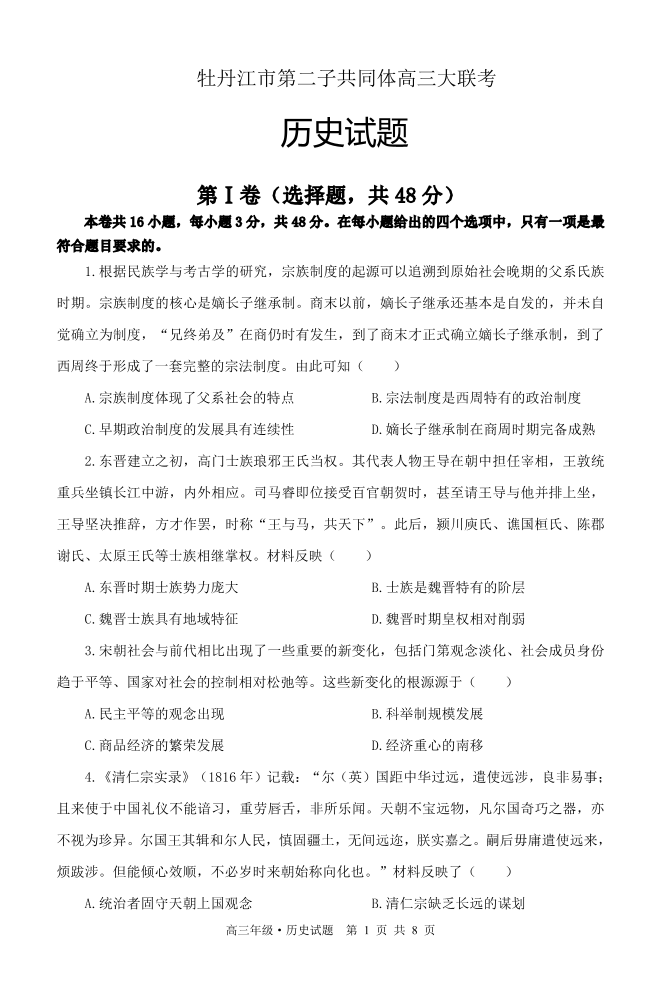 黑龙江省牡丹江市普通高中第二共同体2024届高三上学期期末联考历史+答案