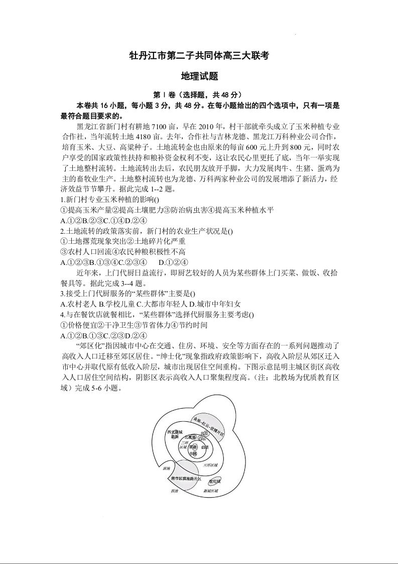 黑龙江省牡丹江市普通高中第二共同体2024届高三上学期期末联考地理+答案