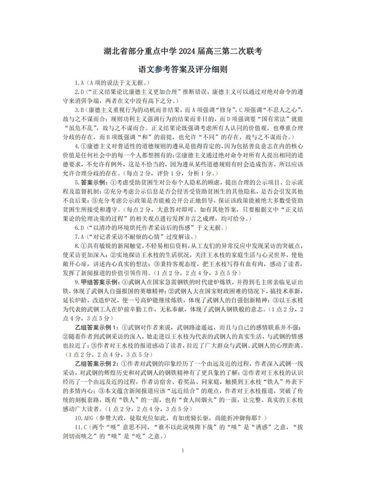 湖北省部分重点中学2024届高三上学期第二次联考语文答案
