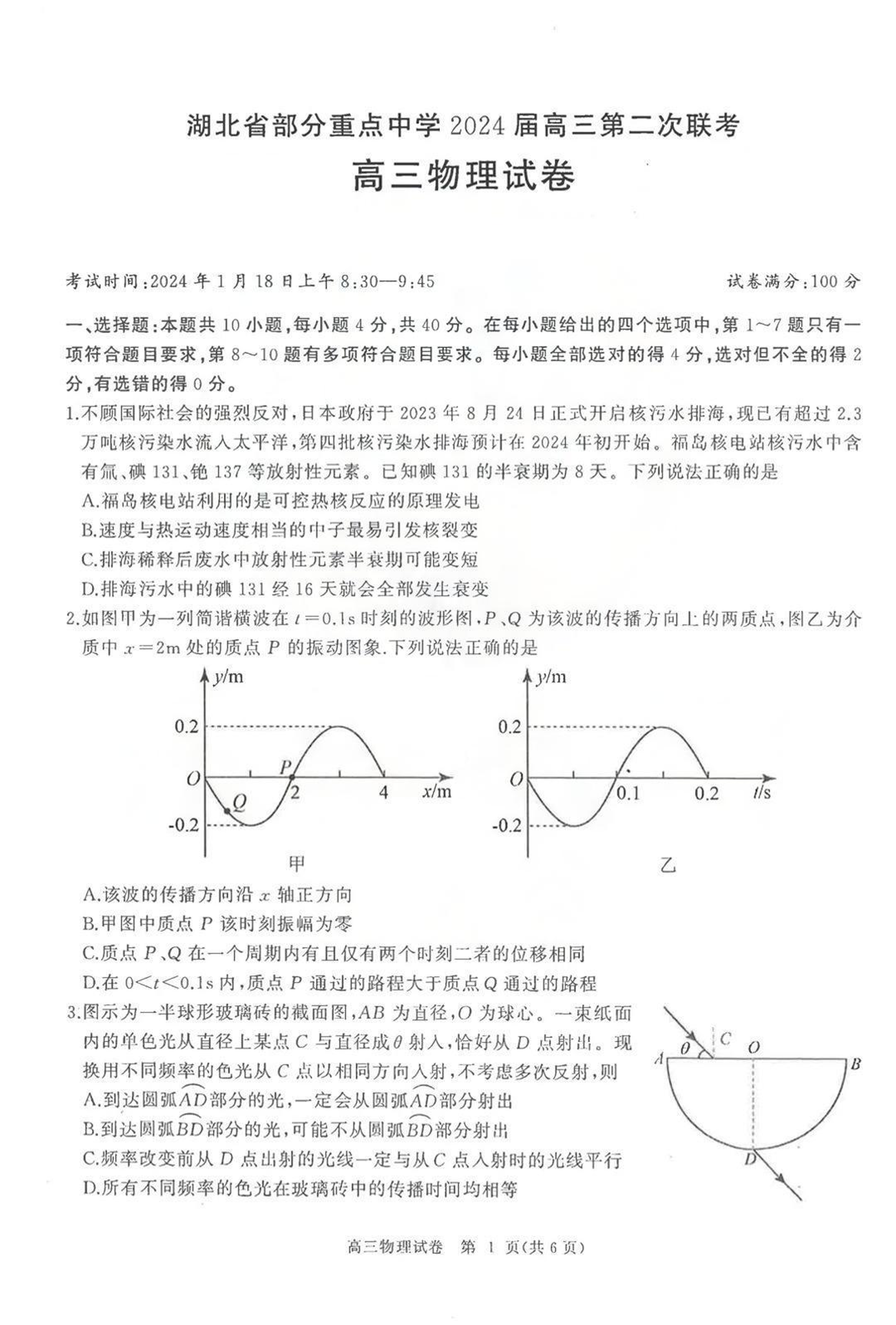 湖北省部分重点中学2024届高三上学期第二次联考物理