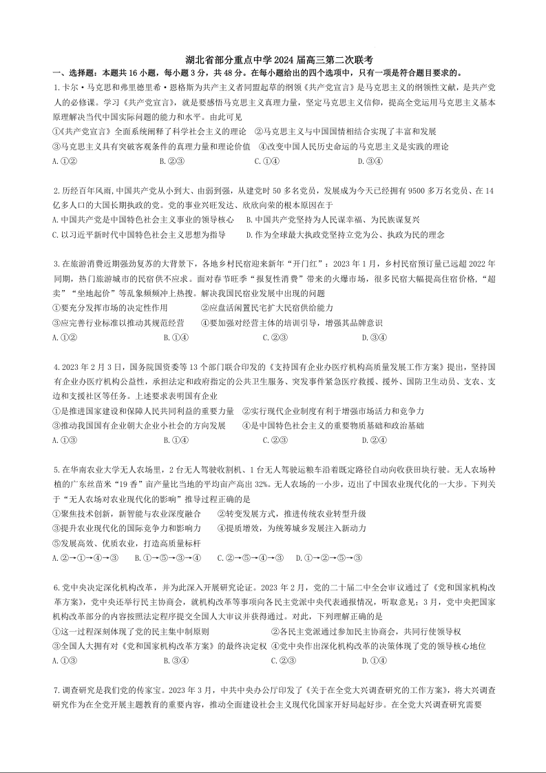 湖北省部分重点中学2024届高三上学期第二次联考政治