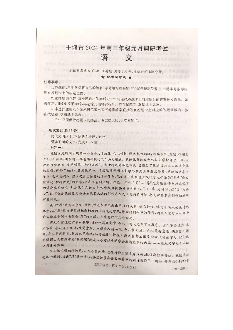 湖北省十堰市2024届高三上学期1月调研考试语文