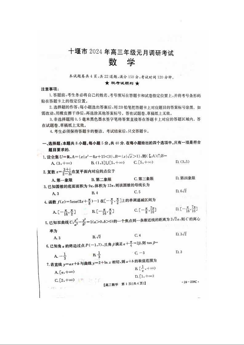 湖北省十堰市2024届高三上学期1月调研考试数学