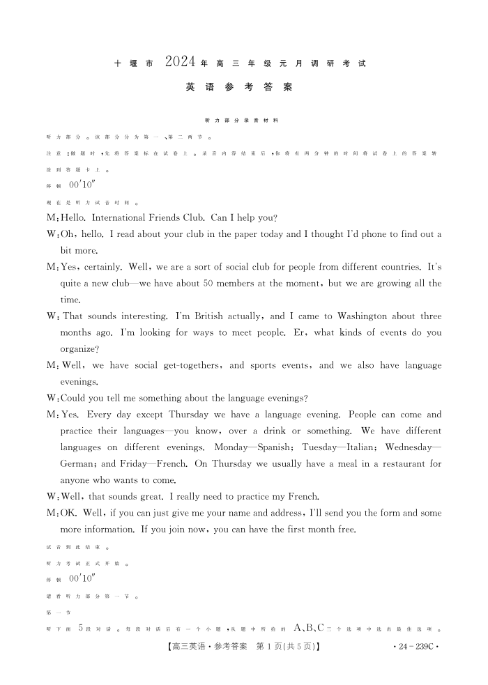 湖北省十堰市2024届高三上学期1月调研考试英语答案