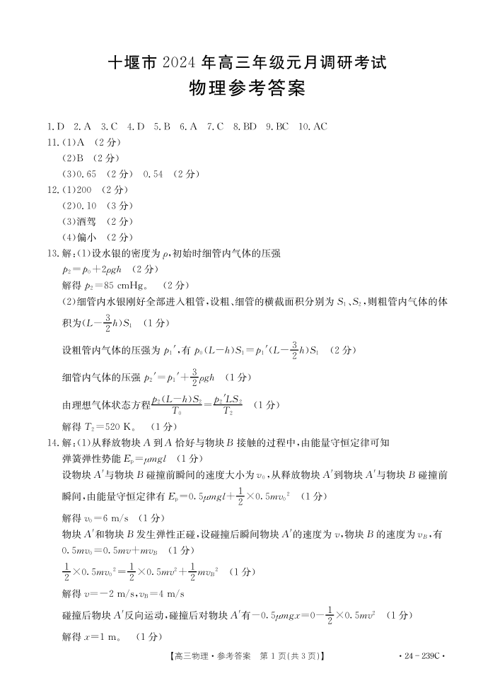 湖北省十堰市2024届高三上学期1月调研考试物理答案
