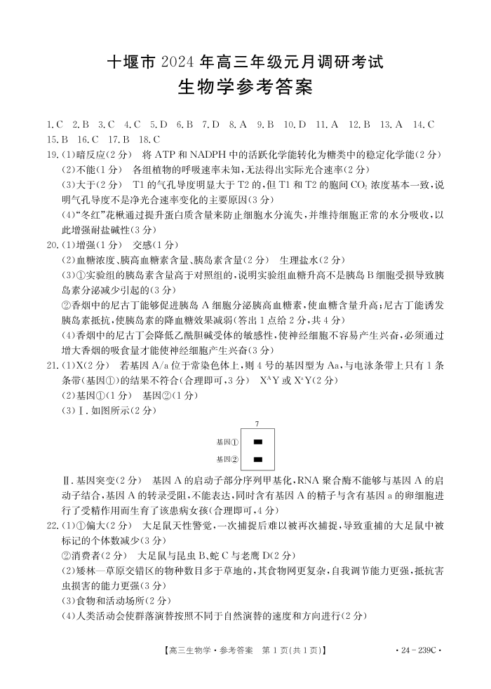 湖北省十堰市2024届高三上学期1月调研考试生物答案