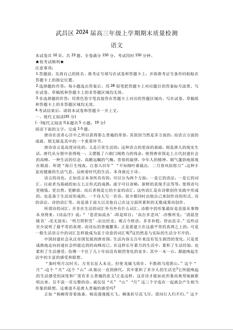 湖北省武汉市武昌区2024届高三上学期期末质量检测试题语文