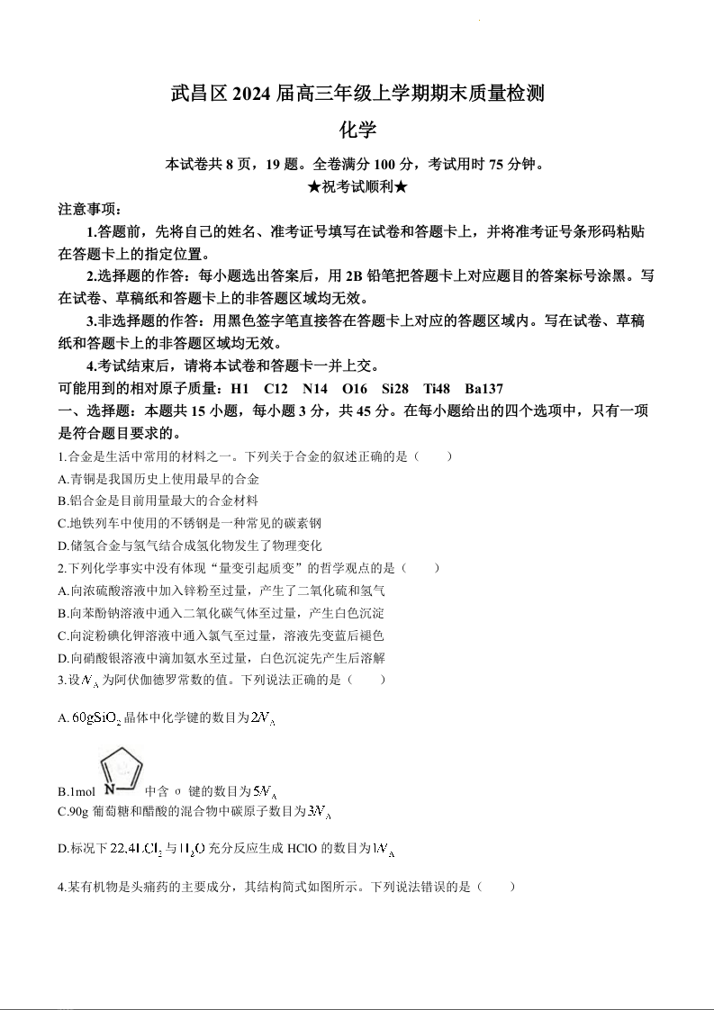 湖北省武汉市武昌区2024届高三上学期期末质量检测试题化学+答案