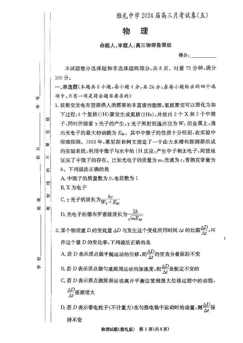 湖南省长沙市雅礼中学2024届高三上学期月考(五)物理+答案