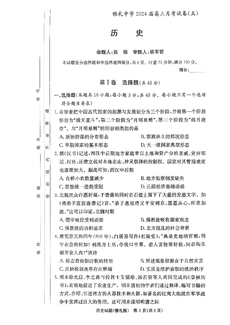 湖南省长沙市雅礼中学2024届高三上学期月考(五)历史+答案