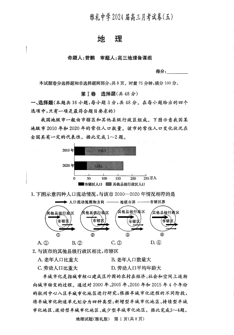 湖南省长沙市雅礼中学2024届高三上学期月考(五)地理+答案