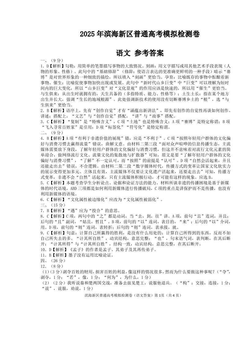 天津市滨海新区2025届高三下学期三模语文答案