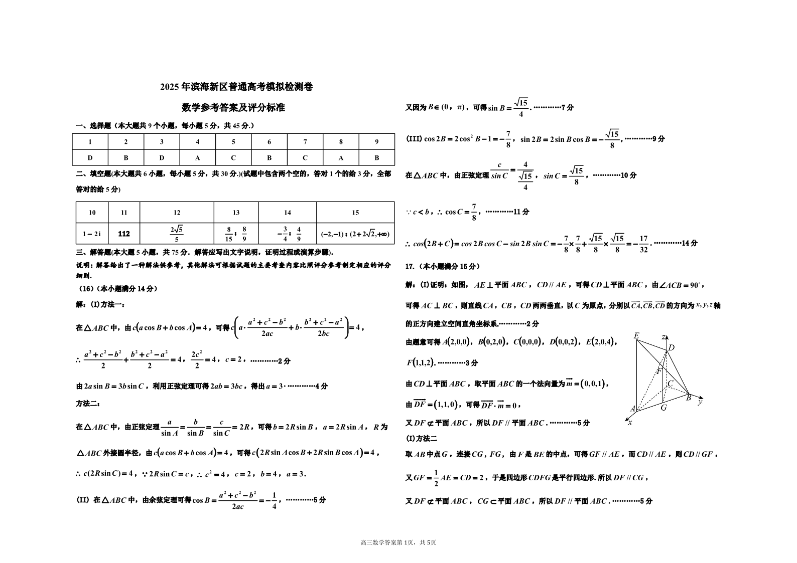天津市滨海新区2025届高三下学期三模数学答案